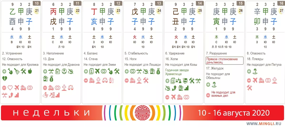 12 августа, среда. Сегодня хорошо “дотягиваться” до более сильного соперника, но выиграть сложно. Будьте внимательны на дороге и за рулем, особенно если в вашей карте бацзы уже есть Свинья и Обезьяна.