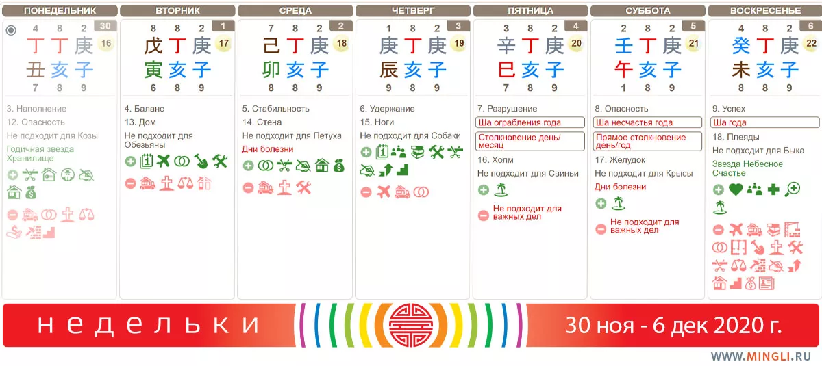 5 декабря, суббота. Также конфликтный день. особенное внимание стоит обратить на него Крысам, тех, у кого в карте бацзы есть столкновение Лошадь-Крыса (две эти зверюхи стоят рядом). Лошадям может также быть несладко. Люди Воды, которым нужна поддержка, могут заработать, хотя и ввязаться в какой-нибудь спор очень вероятно. Не стоит ходить по врачам, начинать лечение, заниматься экстремальными видами спорта.