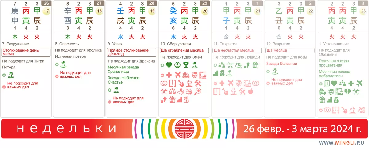 28 февраля, среда. Еще одно Столкновение, на этот раз с годом. Также не подойдет для важных дел, но если вам очень надо что-то сделать (выходящее за рамки привычного и обычного), выбирайте хотя бы час Лошади. Но точно не стоит устраивать строительство, свадьбы, переезды и ремонтные работы – это с большой вероятностью приведет к ссорам в семье и разлукам с близкими. Если в карте Бацзы есть Собаки/Драконы, то повышенное внимание стоит уделить своему поведению – что, кому и как вы говорите, как поступаете. Сегодня ничего не решайте кардинального, лучше отложите.