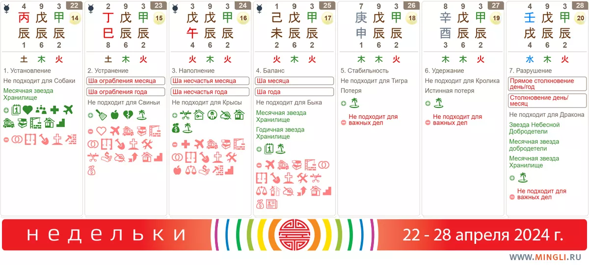 22 апреля, понедельник. «Кому Драконов, Драконов кому!?». У нас их тут три. Так что товарищам с самонаказанием Драконов, особенно Огням и Деревьям, стоит десять раз подумать, прежде чем что-то сказать или сделать. Ну или Собакам по году, с неполезной Землей особенно. А так – день хорош для планирования (тех самых грандиозных задумок, ведь Меркурий скоро заканчивается), переговоров, свиданий, начала медицинской помощи, переезда. Не устраивайте ремонт, свадьбу, не начинайте новые проекты и бизнес.