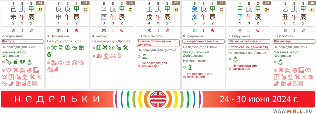 29 июня, суббота. Товарищи спортсмены, а также любители спорта! Сегодняшний день лучше провести дома, ибо сочетание ша несчастья и столкновения часто дает плохой результат в плане травм. Или хоть новые форматы экстремальных развлечений не пробуйте. В первую очередь совет для тех, у кого в Бацзы есть Крыса и Лошадь. Зеленая одежда приветствуется!