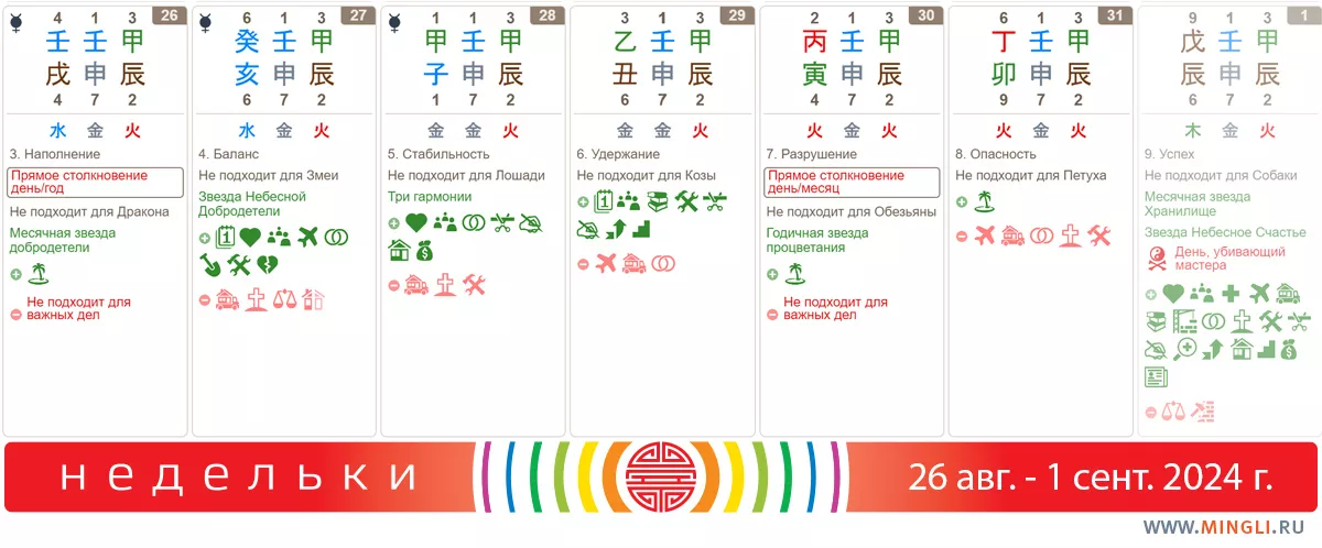 26 августа, понедельник. Начинаем недельку лихо, со столкновения. Поэтому не стоит принимать важные решения, делать что-то судьбоносное, особенно если в вашей карте Бацзы есть Собаки и Драконы и если вам неблагоприятна Вода. Оставляем на этот понедельник только приятное, обыденное и несложное. Ремонт и земляные работы точно начинать не стоит.