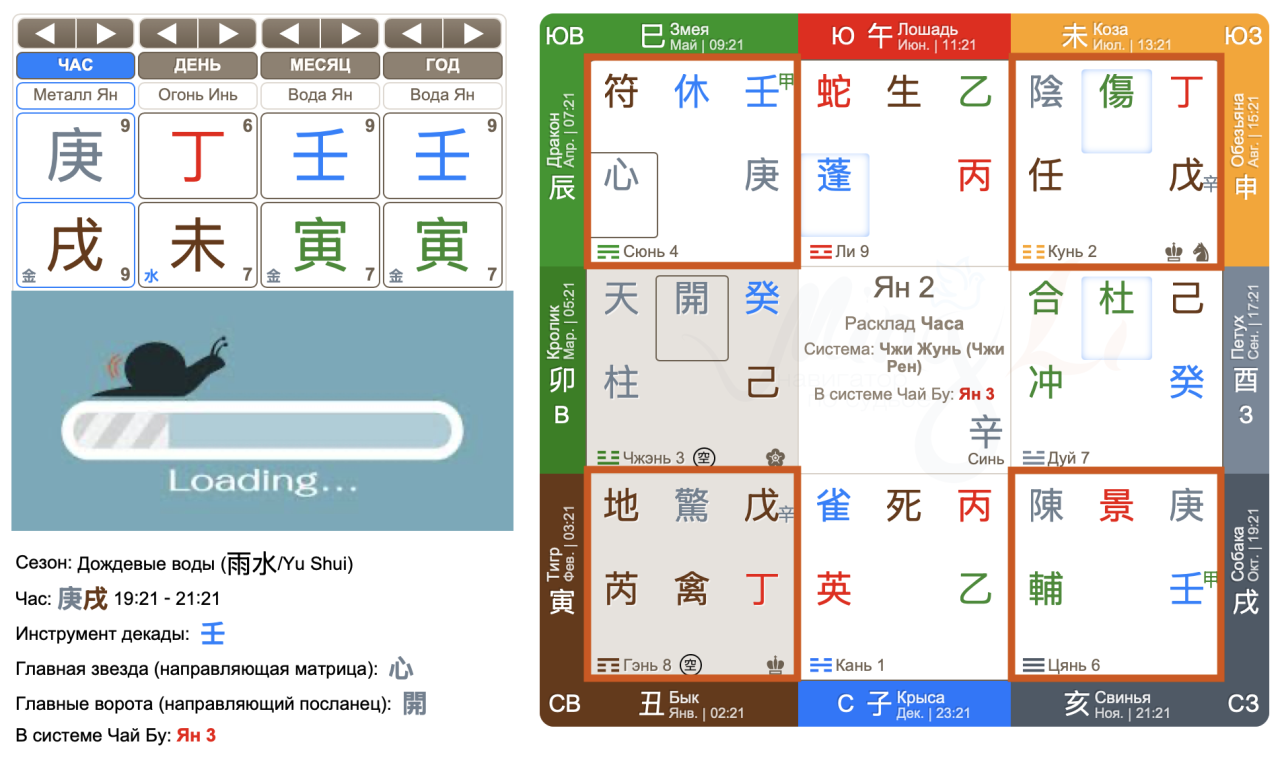 Он говорит о том, что Человек, Небесный ствол Дня 丁, будучи в очень слабой позиции, с ограниченными возможностями, пытается принять решение, тратит силы на 庚 Дело, которых у него при этом совсем нет. В этой связи сделать Дело 庚 очень сложно, да еще и под контролем Тай Суй 壬. Само Дело, Небесный ствол 庚, в этом раскладе находится во Дворце Цянь, который в сезон Весны тоже очень слаб. Главные врата 開 – как итог Дела – счастливые, хотя и разрушены по Дворцу – это значит, могут быть сложности в реализации Дела. Расклад указывает на нестабильную внешнюю ситуацию. Но в какую сторону будут изменения: в лучшую или худшую? Подсказку ищем в местоположении Врат расклада: они говорят о крайне низкой деловой активности. Также нет поддержки ни для Дела, ни для Человека от Главной силы года – Тай Суй 壬.