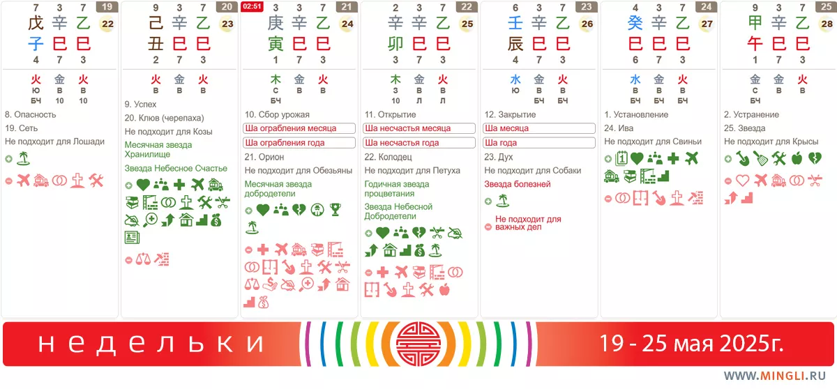 С 21 по 23 мая – неподходящее время для ремонта или земляных работ. Но если вы – Янский Металл или Металл Ян является вашим полезным богом и вы знаете продвинутый Выбор дат – не упустите свой шанс 😉.