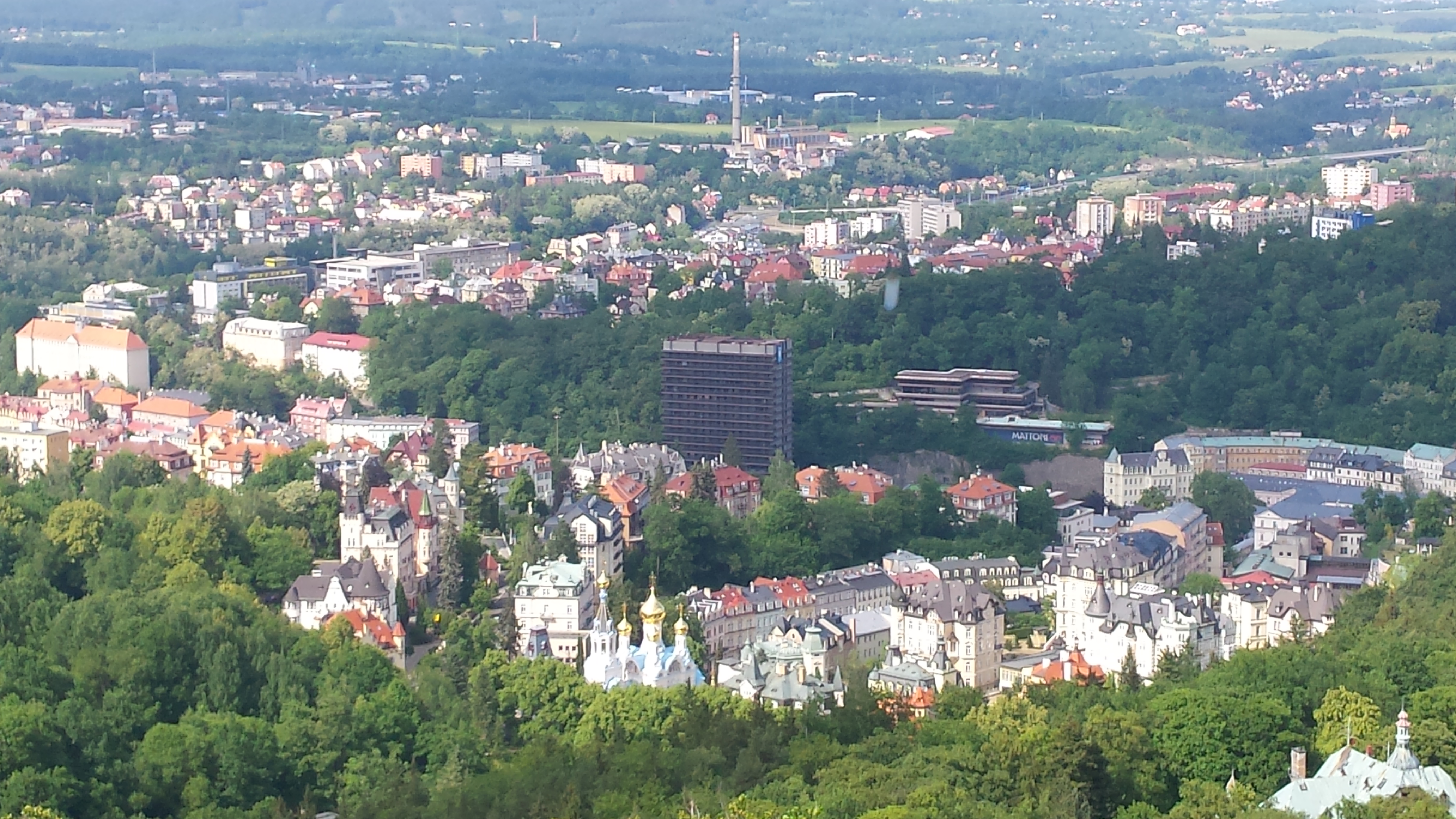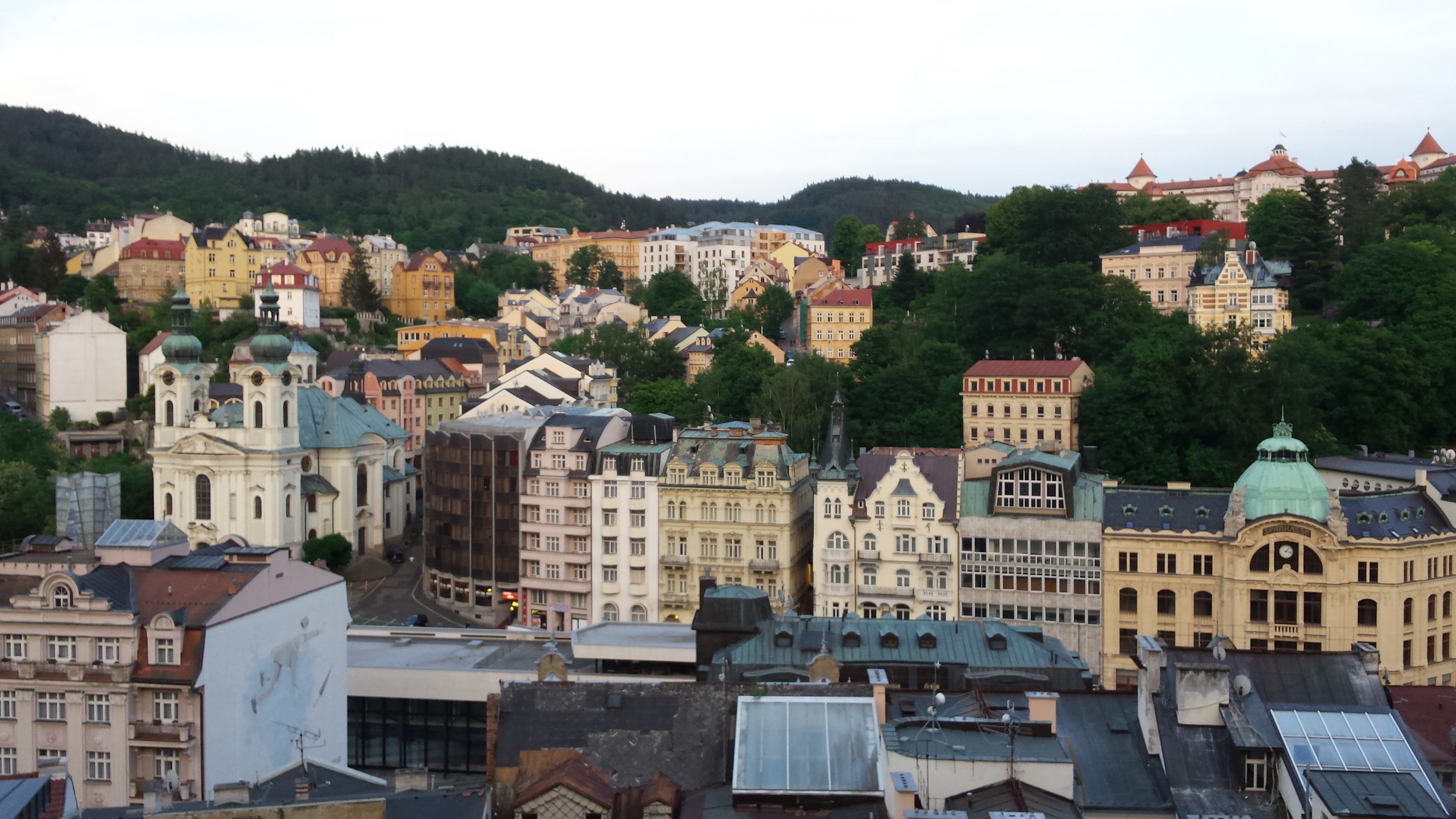 К третьему приезду в Карловы Вары я уже ориентировалась в школе форм и в школе компаса, и поэтому мне было интересно выбрать санаторий не только по моему профилю, но и по фэншуйным правилам. И такой отель нашелся.  У санатория гора и вода с правильной стороны. Гора надежно защищает тыл. Внутреннее пространство получает благоприятную звезду 9. Поэтому санаторий и коллектив в нем дружный, что тоже немаловажно. А вид на город просто потрясающий!