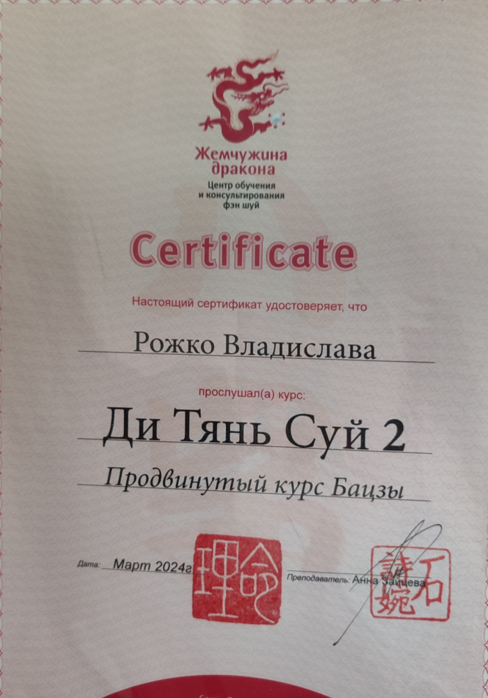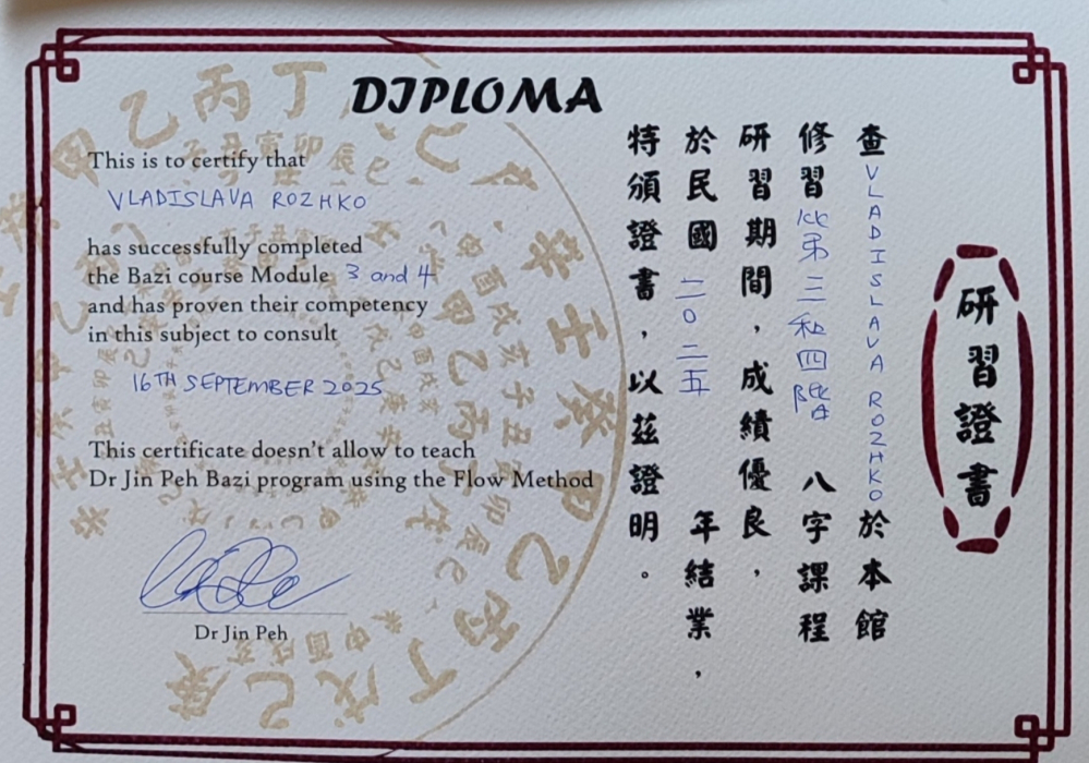 с 2014 года изучаю Бацзы, 2016 Фен Шуй, 2019 Ци Мень Дунь Цзя, 2024 диагностика в ТКМ.