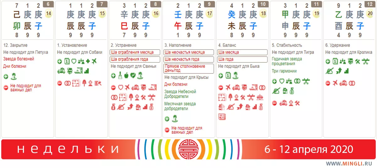 7 апреля. День подходит для того, чтобы начать очередную “новую жизнь”. Лучше всего с планирования и переговоров, так как для активных действий ци еще не созрела. Внимание: если у вас в карте бацзы есть столп (2 иероглифа друг над другом) Янский Металл на Драконе или Янский Металл на Собаке - пожалуйста, оставайтесь дома и будьте внимательны к происходящему.