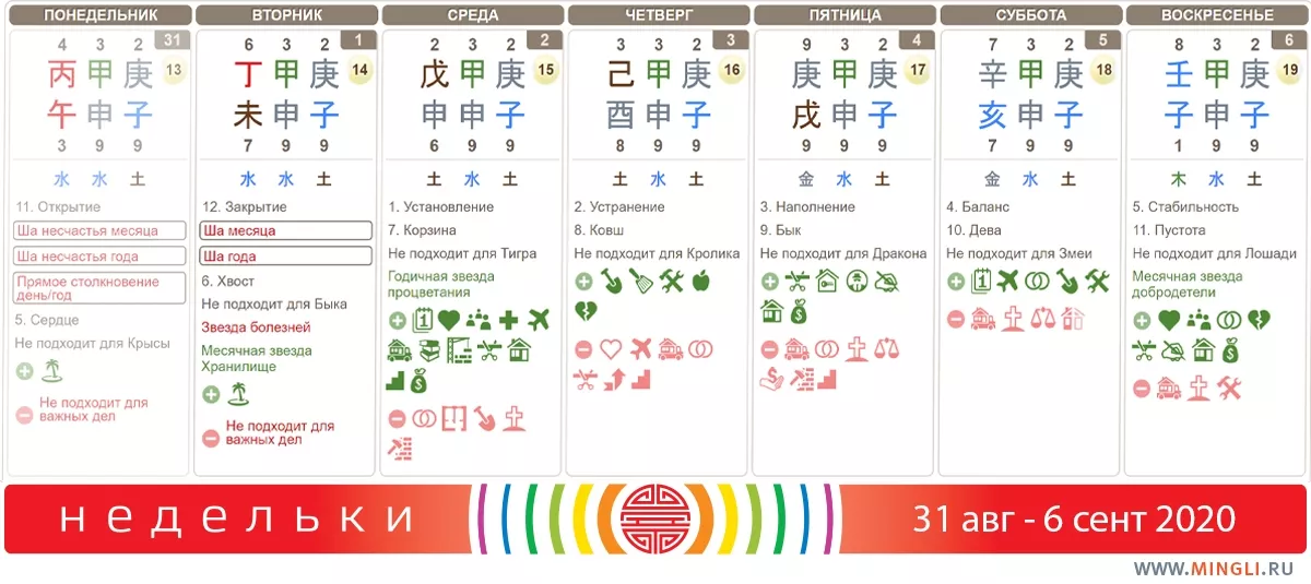 31 августа. Понедельник, как известно, день тяжелый. ;) Постарайтесь не откладывать на этот день все важные дела - энергии конфликтны, могут привести к ссорам и спорам, особенно между мужем и женой, травмам и авариям. Не стоит начинать лечение в этот день. Сегодня и завтра не стоит начинать ремонт.