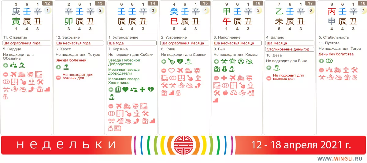 14 апреля, среда. Дубликат месяца. Если в вашей карте есть Водяной Дракон, Водяная Собака или Огненная Собака - постарайтесь провести день спокойно. В целом, денек неплох для переговоров, свиданий, важных бесед - проверьте только карту вашего визави: главное, чтобы там не было Собаки;) Если она там есть - лучше не рисковать и перенести беседу на день получше! Новые проекты начинать не стоит.