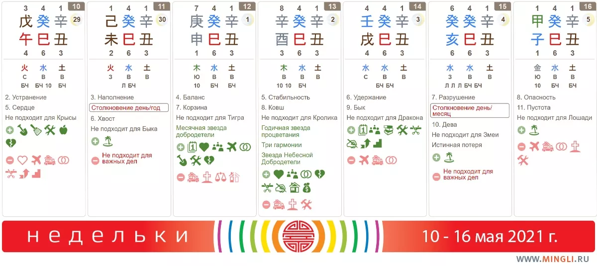 12 мая, среда. Сегодняшний день неплох, особенно для переговоров, свиданий или планирования. Не годится для переезда или каких-то грандиозных событий, так как энергия дня противоречит ци сезона. Лучше всего использовать сегодняшний и завтрашний дни, только если Металл вам благоприятен.