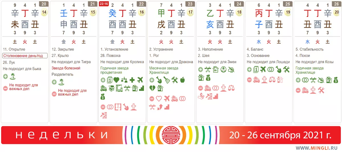 23 сентября, четверг. Отличный день для того, чтобы затеять уборку, избавиться от вредных привычек, заняться своим телом, сесть на диету. Можно также начинать новый бизнес и проекты, но лучше всего такие, которые сначала разрушают что-то старое. Также четверг подходит для ценных приобретений, так что не прячьте кошелек слишком далеко) Например, прикупите Справочник фэн шуй и ежедневник на 2022 год.