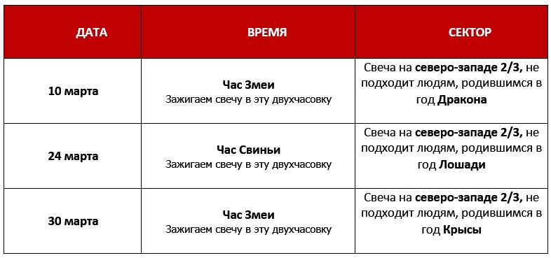 6, 18, 30 марта. Подходит для свадьбы, строительства, начала путешествия, переговоров. Но будьте осторожны – не планируйте дела, в которых хотите выиграть, так как энергии этого дня приводят все силы к балансу. Вот если вы слабее – ваша позиция выровняется. Не подходит для судебных процессов, написания завещания. 18 и 30 марта нежелательно навещать больных. Не подходят для рожденных в год Крысы.