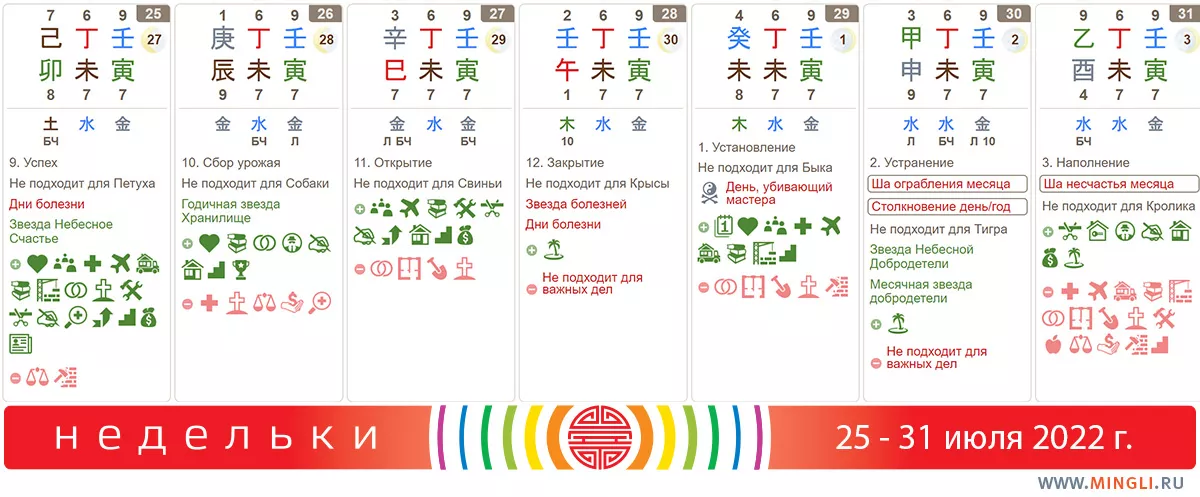 29 июля, пятница. Хорошо планировать, обсуждать, договариваться. Рожденным в день иньской Воды или дни Дерева может не хватить ресурса на все, что задумано, так что найдите время для отдыха и восстановления сил. Для серьезных начинаний пятницу лучше не выбирать. Фэншуисты сегодня отдыхают - день убийства Мастера.