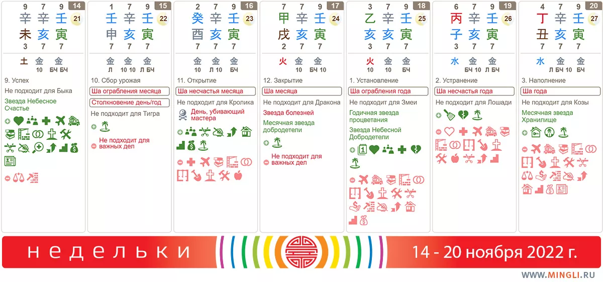 14 ноября, понедельник. Отличный день, особенно если Металл вам полезен. Учитывая, что потом, в остальные дни недели, есть какие-то нюансы и минусы, на сегодня лучше запланировать ваши великие дела. День подойдет для любых позитивных занятий. Кому он противопоказан? Тем, кому не полезен Металл, а также Быкам по году рождения (или если Бык есть у вас в карте и полезен). Также помните, что в дни ша – до конца недели – не начинаем ремонт или земляные работы, поэтому, если реновация в планах, ее лучше начать сегодня.