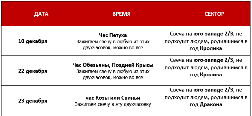 - Дни «разрушения» – 7, 19, 31 декабря особенно опасны для людей, у которых в карте уже есть столкновение Крыса-Лошадь.