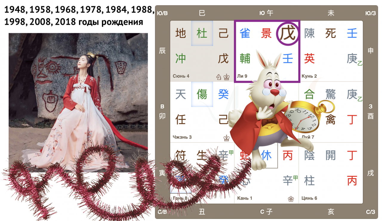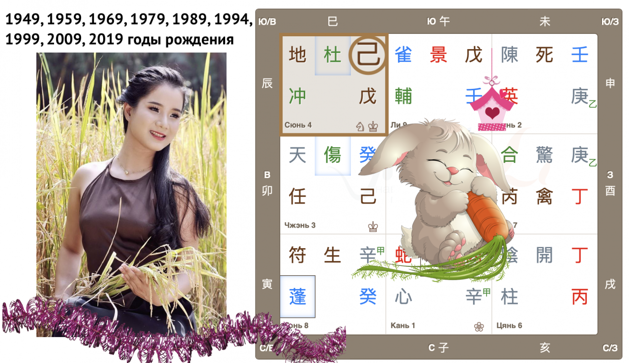 Как видим, Небесный ствол года 癸 Гуй (иньская вода) опустился в дом Чжэнь с Земной ветвью 卯 Мао (Кролик). Вот так сюрприз! Ствол и ветвь приходящего года в одном дворце, так случается далеко не всегда. Можем предположить, что влияние энергий года четко выражено, удвоено.