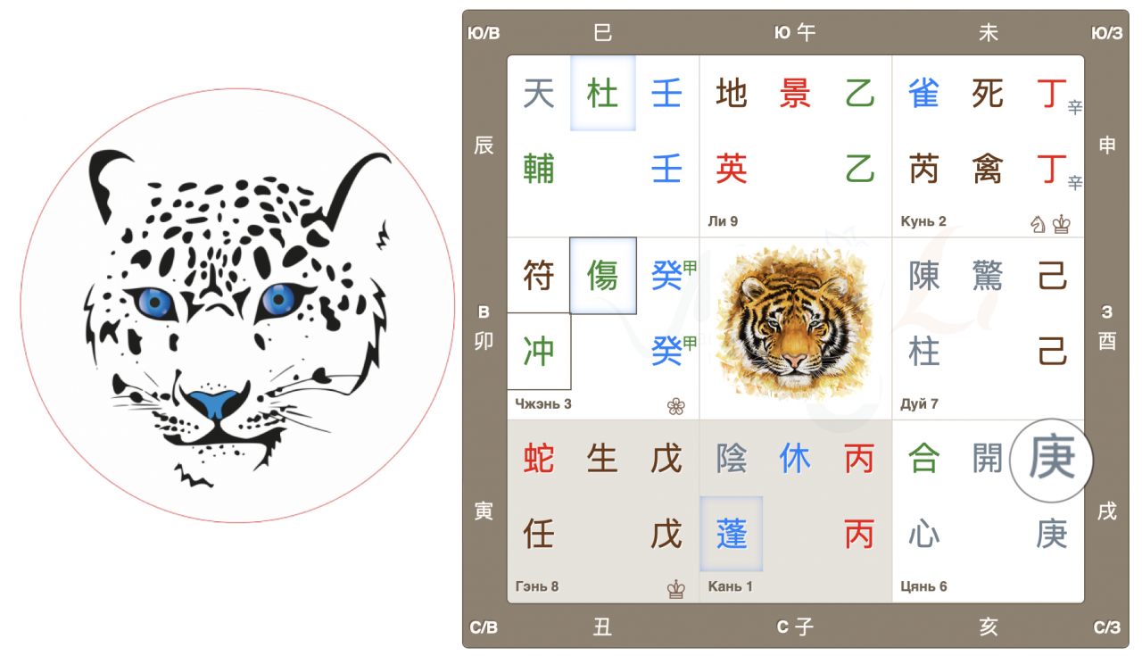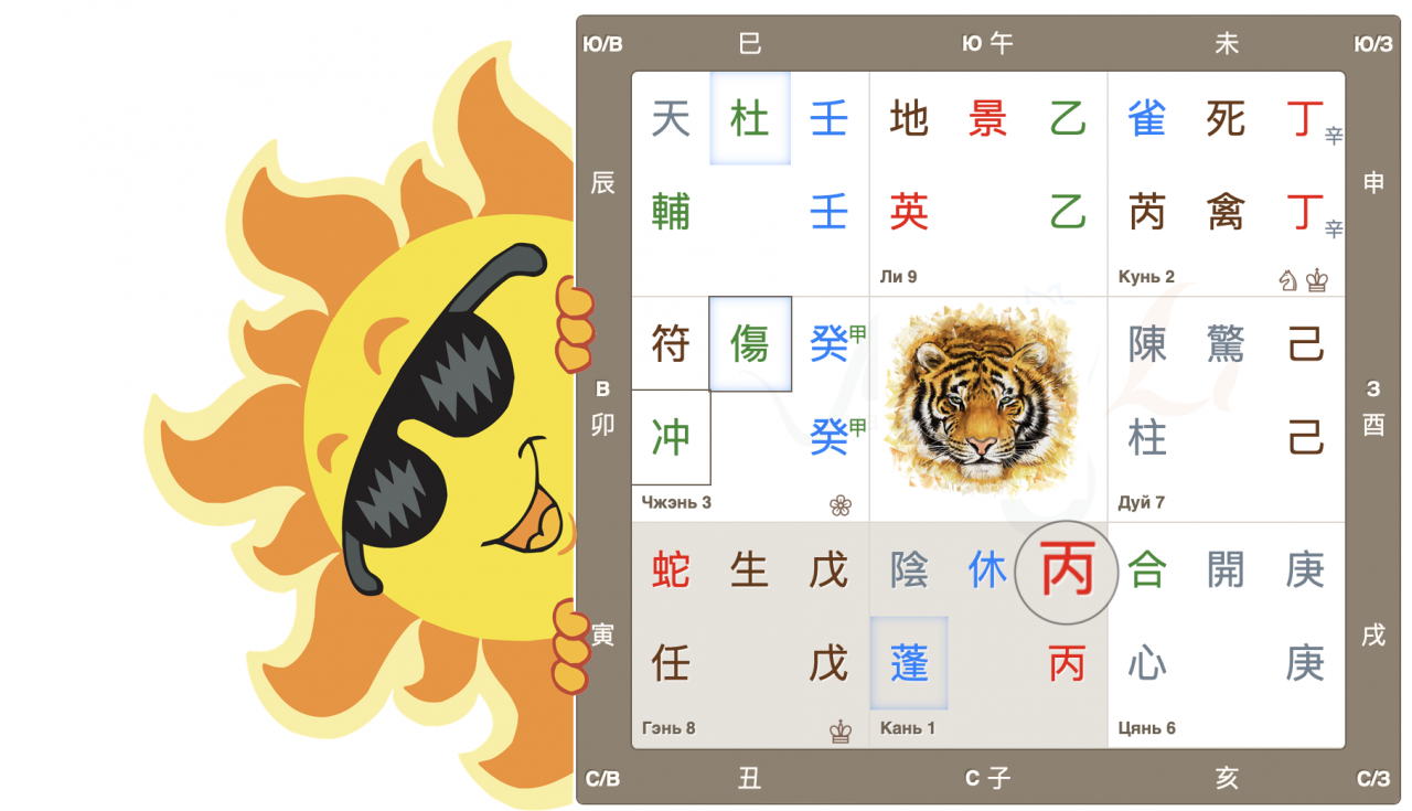 Дворец Чжэнь, движение Дерева, начало нового, быстрый рост. Врата ранения 傷 находятся в своем домашнем дворце и являются главными в раскладе. Это очень активные, азартные врата, жаждущие перемен, перемещений и поездок. Настала весна, время двигаться, и люди этого хотят. Да и родная звезда 冲 также добавляет мощный импульс для начинаний.