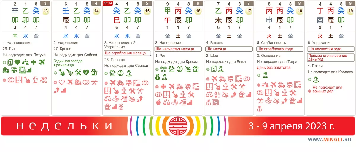 5 апреля, среда. Первый день месяца обычно используют для активизаций, но точно не для важных мероприятий, так как ци еще нестабильна. Сегодня точно не стоит затевать земляные работы, ремонт, начинать поездку, подписывать важные документы и решать финансовые вопросы.