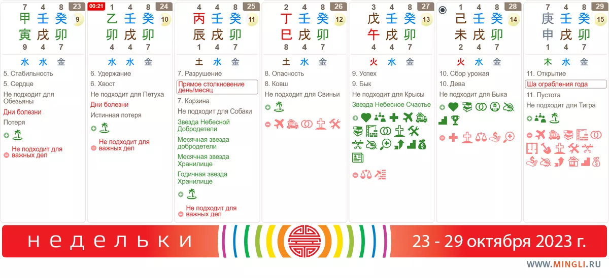 23 октября, понедельник. Сегодня занимаемся только привычными и второстепенными делами, так как день Потери не дает шансов серьезным начинаниям осуществиться как надо. Осторожнее при посещении больниц, поликлиник и заболевших друзей – шанс подцепить какой-нибудь вирус выше обычного.