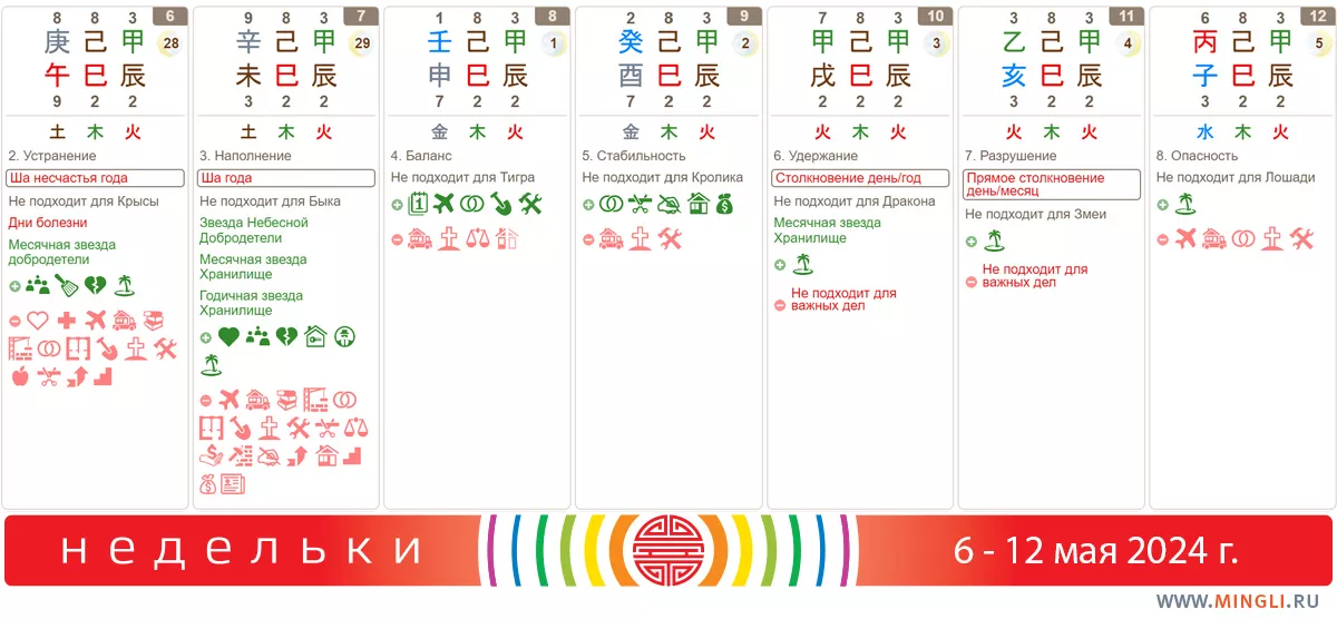 11 мая, суббота. Китайцы советуют: «Не выбирайте день 亥 этого месяца. Нарушение этого правила принесет потерю богатства, болезни, судебные разбирательства и нападение из-за спины». И неудивительно – сегодня опять столкновение, на этот раз дня с месяцем. Эмоции у некоторых людей могут выходить из-под контроля, поэтому постарайтесь не задевать окружающих, особенно, если в вашей карте Бацзы есть Свинья и/или Змея. Выберите зеленый цвет для одежды – это поможет вам провести день гармоничнее.