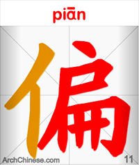 Поле значений первого иероглифа, 偏 piān, можно описать словом «односторонний» или «однобокий», «покосившийся», «окраинный». Сам знак, как и многие другие иероглифы китайского языка, состоит из двух частей: корня (亻/人 rén, «человек») и фонетического компонента (扁 biǎn, или piān, «плоский», «тонкий»; «вывеска»), подсказывающего произношение. Этот знак встречается в названиях и других божеств карты – например, Косого Богатства или 7 Убийцы.