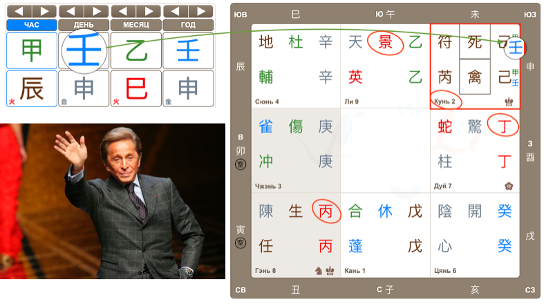 Есть в карте Валентино еще один важный фактор, который усилил это качество многократно и помог сделать судьбоносный ход. Речь о внутренней комбинации Звезде 禽 Тянь Цинь и глубине Врат 死 Сы Мэнь. Ключ — в их активации временем. Когда наступил тот самый период, эта «тихая» энергия получила мощный внешний импульс. Она сфокусировалась, как солнечный луч через линзу, и выплеснулась тем самым фирменным красным, изменившим всю историю моды.