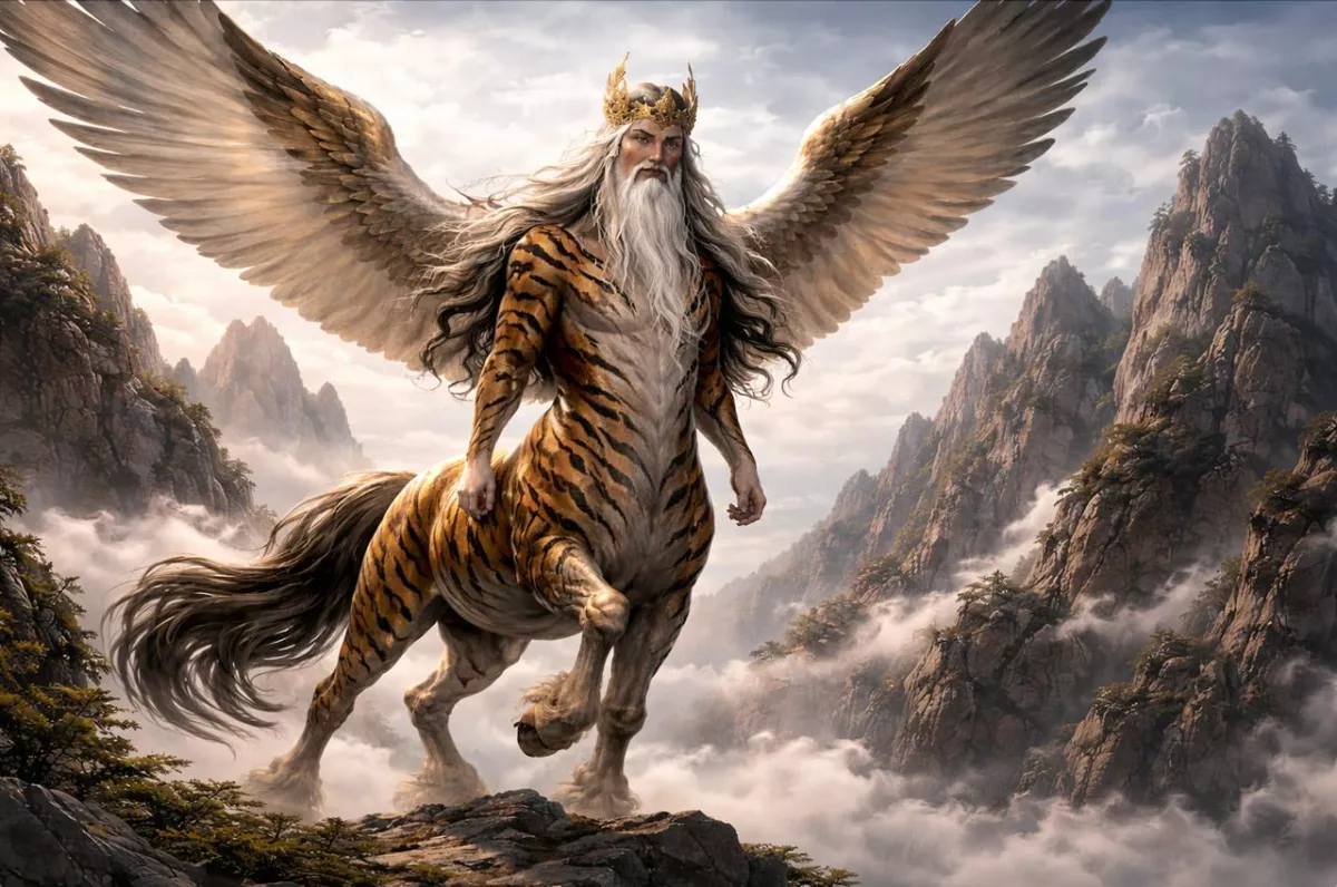 Первым видим дедушку Иншао (иногда называют Инчжао, тут кому как с дикцией повезло). Дед своеобразный, конечно. У него тело коня, но лицо человеческое. Это еще не все: родственничек полосат и крылат! Летает по делам туда-сюда, в основном над морями. Покрикивает сверху. Голос еще тот – напоминает водяной насос. Старичок-то совсем не старичок - носится молнией. Говорят, что он работает посыльным у самого Небесного Владыки и часто связывает мир наш с миром иным. На высоких постах, короче, со связями дед.