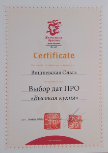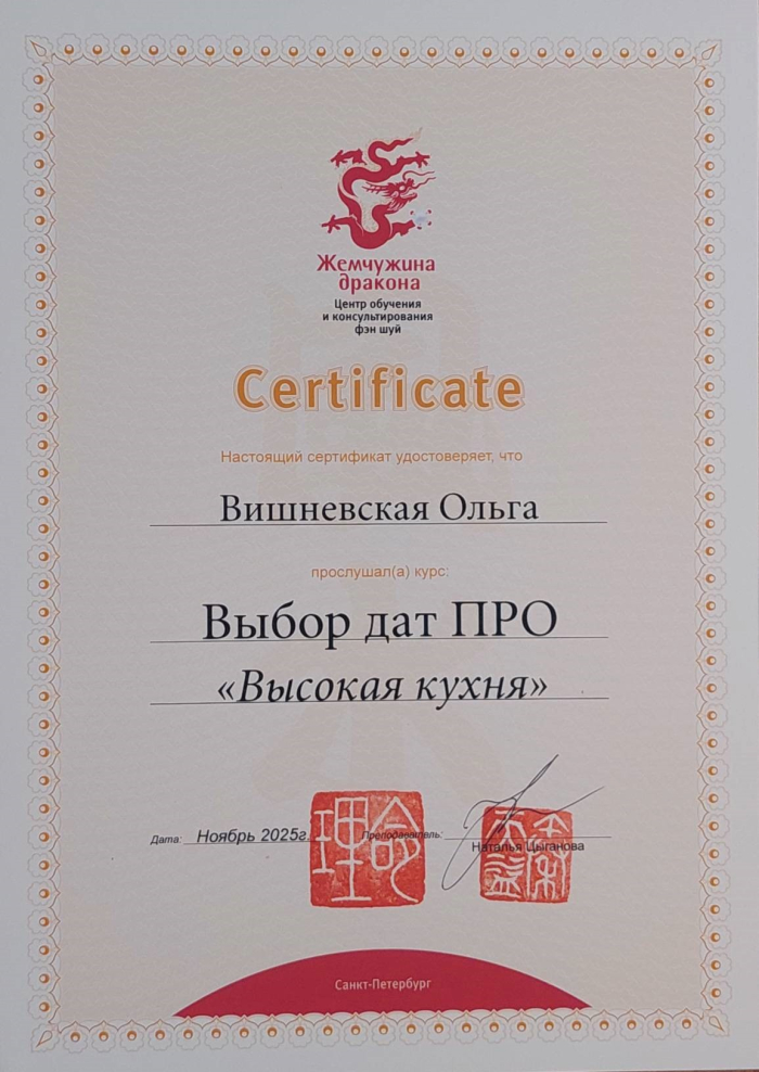 Являюсь сертифицированным консультантом по специализациям "анализ судьбы", «фэн-шуй» и "повышение удачи" от центра обучения и консультирования "Жемчужина дракона".